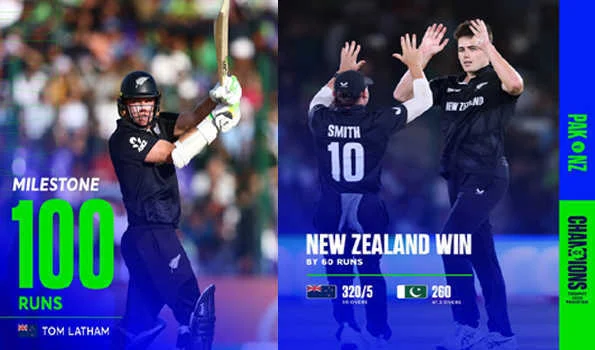 कराची 19 फरवरी (लाइव 7) टॉम लेथम (नाबाद 118), विल यंग (107) की शतकीय और ग्लेन फिलिप्स (61) रनों की अर्धशतकीय पारियों के बाद विलियम ओरूर्क और मिचेल सैंटनर (तीन-तीन विकेट) के शानदार प्रदर्शन की बदौलत न्यूजीलैंड ने बुधवार को चैंपियंस ट्रॉफी के उद्घाटन मुकाबले में पाकिस्तान को 60 रनों से हराया।