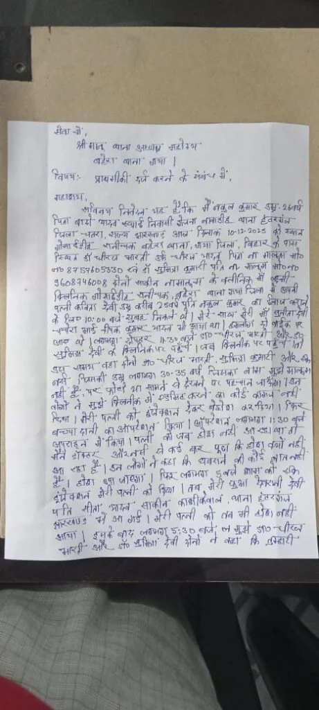 मृतक महिला की पहचान चतरा जिले के हंटरगंज थाना क्षेत्र के गेजना पंचायत अंतर्गत नावाडीह गांव निवासी कविता देवी (उम्र करीब 25 वर्ष) पति नकुल यादव के रूप में हुई है। पीड़ित पति नकुल यादव ने बताया कि वह अपनी पत्नी कविता देवी को इलाज के लिए आज गोमाईडीर, रानीचक स्थित ‘माँ लक्ष्मी क्लिनिक’ में लाए थे। क्लीनिक पर डॉ. धीरज भारती उर्फ धीरज यादव और डॉ. सुमित्रा कुमारी मौजूद थे। दोपहर 1:30 बजे क्लीनिक पहुंचने पर, कविता देवी को इंजेक्शन देकर बेहोश किया गया और बच्चादानी का ऑपरेशन किया गया। ऑपरेशन के बाद जब कविता देवी को होश नहीं आया, तो नकुल ने डॉक्टर और नर्स से कई बार पूछा। उन लोगों ने कहा कि घबराने की बात नहीं है, शाम तक होश आ जाएगा, और उसे दो इंजेक्शन और दिए। शाम करीब 5:30 बजे, जब कविता देवी की हालत और बिगड़ने लगी, तो दोनों डॉक्टरों (धीरज भारती और सुमित्रा देवी) ने नकुल को बताया कि उनकी पत्नी की हालत बिगड़ रही है, उन्हें गया मेडिकल में भर्ती कराना होगा। डॉक्टरों ने नकुल, उनकी फुआ देवरानी देवी और पत्नी कविता देवी को अपनी सफेद स्कॉर्पियो में बिठाया और सराय मेडिकल की तरफ निकल गए। जैसे ही वे अस्पताल पहुंचे और नकुल भर्ती के बारे में पता करने गए, मौका पाकर दोनों डॉक्टर, ड्राइवर और गाड़ी लेकर चोरी से फरार हो गए। इसके बाद, मगध मेडिकल के डॉक्टरों ने नकुल को बताया कि उनकी पत्नी मर चुकी है। नकुल एम्बुलेंस से पत्नी का शव लेकर वापस क्लिनिक पर आए, तो देखा कि डॉक्टर क्लीनिक का बोर्ड हटाकर और ताला लगाकर फरार हो गए हैं, और दोनों के मोबाइल स्विच ऑफ थे।