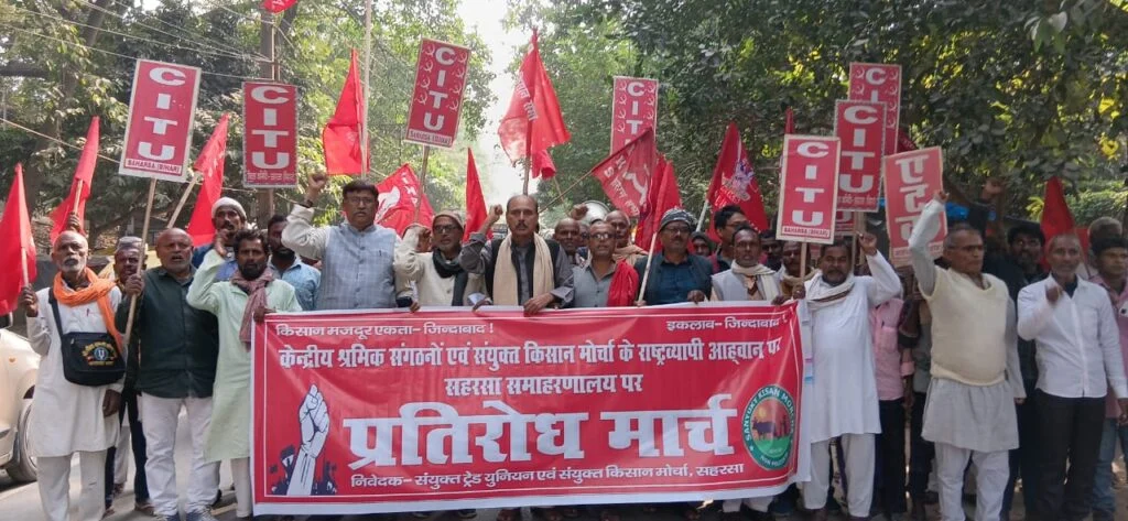 संयुक्त ट्रेड यूनियन एवं संयुक्त किसान मोर्चा के राष्ट्रीय व्यापी आवाहन पर मजदूर विरोधी किसान विरोधी कानून के खिलाफ बुधवार को समाहरणालय द्वार पर जमकर प्रदर्शन कर प्रतिरोध मार्च किया गया।प्रदर्शन कारी वीर कुंवर सिंह चौक से सीटू एटक एवं किसान संगठनो के झंडों बैनर तले किसान मजदूरों का बड़ी जत्था सरकार के खिलाफ विभिन्न मांग को लेकर जमकर नारेबाजी की।प्रमुख मांग के रूप में मजदूर विरोधी चार लेवर कोड बिल रद्द करने, बख्तियारपुर एवं सोनवर्षा श्रम प्रवर्तन पदाधिकारी को निलंबित करने, किसानों के फसलों का सही दाम देने, एमएसपी की गारंटी करने, मैथा चक्रवर्ती तुफान से छति हुई फसल का उचित मुआवजा किसानों को देने, धान क्रय और भुगतान तुरंत शुरू करने, खाद बीज की किल्लत एवं कालाबाजारी पर रोक लगाने की मांग शामिल है।जिला समाहरणालय पर प्रतिरोध मार्च सभा में तब्दील हो गया।