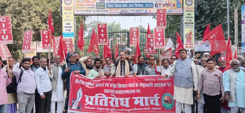 संयुक्त ट्रेड यूनियन एवं संयुक्त किसान मोर्चा के राष्ट्रीय व्यापी आवाहन पर मजदूर विरोधी किसान विरोधी कानून के खिलाफ बुधवार को समाहरणालय द्वार पर जमकर प्रदर्शन कर प्रतिरोध मार्च किया गया।प्रदर्शन कारी वीर कुंवर सिंह चौक से सीटू एटक एवं किसान संगठनो के झंडों बैनर तले किसान मजदूरों का बड़ी जत्था सरकार के खिलाफ विभिन्न मांग को लेकर जमकर नारेबाजी की।प्रमुख मांग के रूप में मजदूर विरोधी चार लेवर कोड बिल रद्द करने, बख्तियारपुर एवं सोनवर्षा श्रम प्रवर्तन पदाधिकारी को निलंबित करने, किसानों के फसलों का सही दाम देने, एमएसपी की गारंटी करने, मैथा चक्रवर्ती तुफान से छति हुई फसल का उचित मुआवजा किसानों को देने, धान क्रय और भुगतान तुरंत शुरू करने, खाद बीज की किल्लत एवं कालाबाजारी पर रोक लगाने की मांग शामिल है।जिला समाहरणालय पर प्रतिरोध मार्च सभा में तब्दील हो गया।