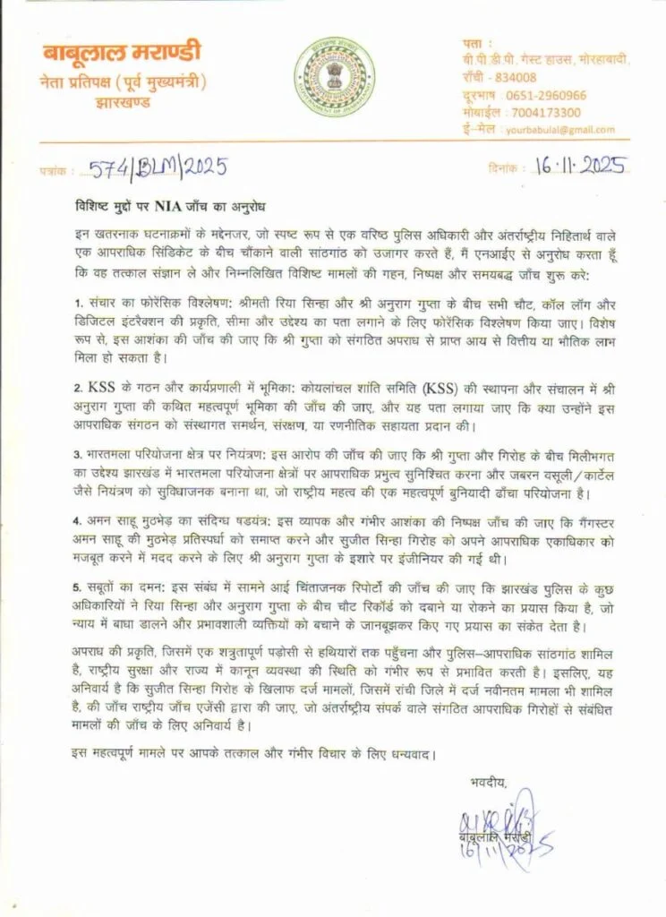 बाबूलाल मरांडी ने अपने पत्र में लिखा है कि इन खतरनाक घटनाक्रमों के मद्देनजर, जो स्पष्ट रूप से एक वरिष्ठ पुलिस अधिकारी और अंतर्राष्ट्रीय निहितार्थ वाले एक आपराधिक सिंडिकेट के बीच चौंकाने वाली सांठगांठ को उजागर करते हैं. मैं एनआईए से अनुरोध करता हूं कि वह तत्काल संज्ञान ले और निम्नलिखित विशिष्ट मामलों की गहन, निष्पक्ष और समयबद्ध जांच शुरू करें.