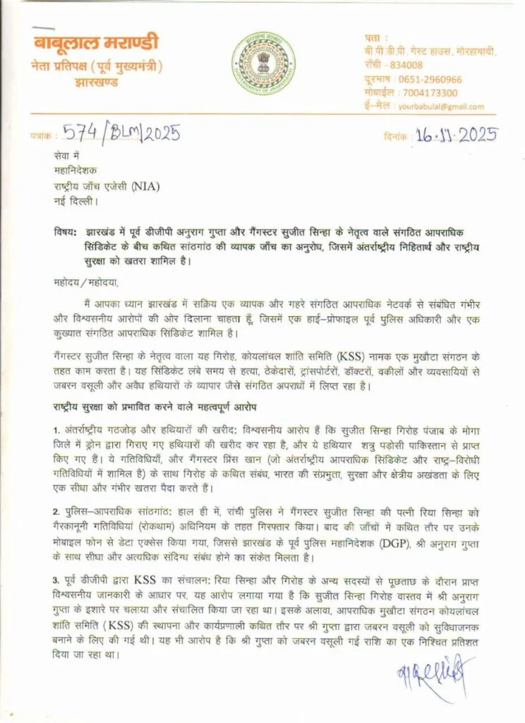 झारखंड के नेता प्रतिपक्ष और पूर्व मुख्यमंत्री बाबूलाल मरांडी ने राष्ट्रीय जांच एजेंसी (NIA) को पत्र लिखा है. जिसमें उन्होंने झारखंड के पूर्व डीजीपी अनुराग गुप्ता और जेल में बंद गैंगस्टर सुजीत सिन्हा गिरोह के बीच कथित सांठगांठ की व्यापक जांच की मांग की है.बाबूलाल मरांडी ने आरोप लगाया है कि यह नेटवर्क मूल रूप से चलने वाला संगठित आपराधिक सिंडिकेट है, जिसके तार सीमा पार एंटी-नेशनल गतिविधियों से भी जुड़े होने की आशंका है. उन्होंने अपने पत्र में सुरक्षा एजेंसियों के लिए सबसे चिंताजनक पहलू के रूप में सुजीत सिन्हा गिरोह की कथित अंतरराष्ट्रीय हथियार सप्लाई चेन की ओर संकेत किया है. आरोप है कि गिरोह पंजाब के मोगा जिले में ड्रोन से गिराए गए हथियारों की खरीद कर रहा है. ये हथियार शत्रु पड़ोसी पाकिस्तान से पहुँचाए जा रहे हैं, जो भारत की क्षेत्रीय अखंडता के लिए सीधा खतरा है.