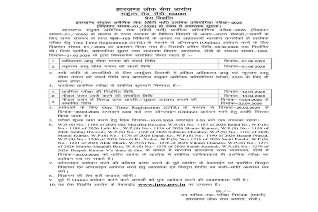झारखंड लोक सेवा आयोग ने झारखंड असैनिक संयुक्त सिविल सेवा प्रतियोगिता परीक्षा 2025 के लिए आवेदन की अंतिम तिथि बढ़ा दी है। अब अभ्यर्थी 9 मार्च शाम 5 बजे तक ऑनलाइन आवेदन कर सकते हैं, जबकि आवेदन शुल्क जमा करने की अंतिम तिथि 10 मार्च शाम 5 बजे निर्धारित की गई है।