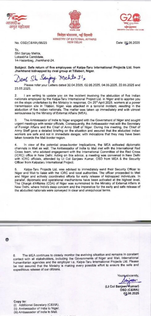 पश्चिम अफ्रीकी देश नाइजर में आतंकियों द्वारा अपहृत झारखंड के गिरिडीह जिले के बगोदर क्षेत्र के पाँचों भारतीय मजदूर अब सुरक्षित भारत लौट आए हैं। वर्तमान में सभी मजदूर मुंबई में हैं, जहाँ उनका स्वास्थ्य परीक्षण एवं आवश्यक सरकारी और कानूनी औपचारिकताएँ पूरी की जा रही हैं। प्रक्रिया पूर्ण होने के बाद वे शीघ्र ही अपने-अपने घर लौटेंगे। इस संबंध में आजसू पार्टी के केंद्रीय महासचिव सह प्रवक्ता संजय मेहता ने पार्टी मुख्यालय में आयोजित प्रेस कॉन्फ्रेंस के दौरान जानकारी दी।