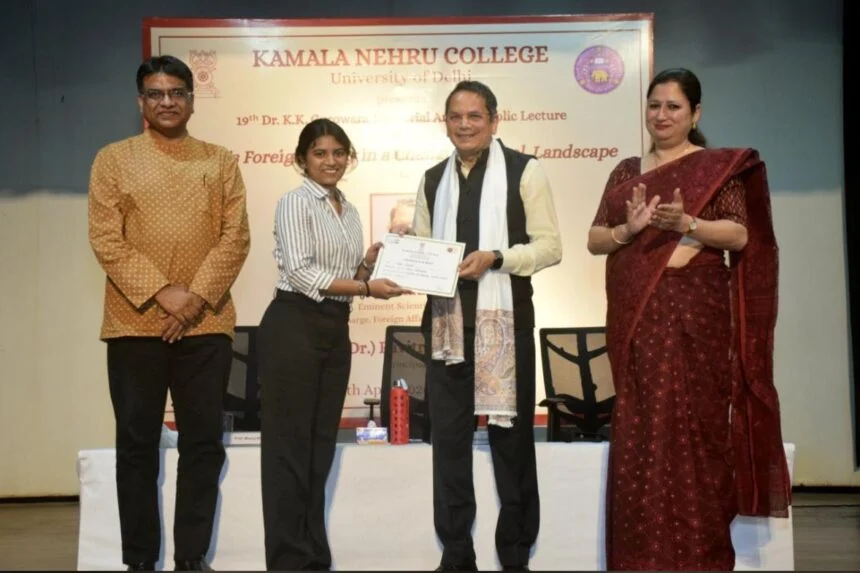 नई दिल्ली/रांची/सिमडेगा : दिल्ली विश्वविद्यालय के प्रतिष्ठित कमला नेहरू कॉलेज (KNC) में आयोजित 19वें डॉ. के.के. गोरवारा मेमोरियल वार्षिक पब्लिक लेक्चर के दौरान कॉलेज की मेधावी छात्रा सिमडेगा की बेटी निधि चंदा को ‘डॉ. के.के. गोरवारा मेमोरियल ऑल राउंडर स्टूडेंट अवार्ड’ से सम्मानित किया गया। इस उपलब्धि से कॉलेज परिसर में खुशी का माहौल है।