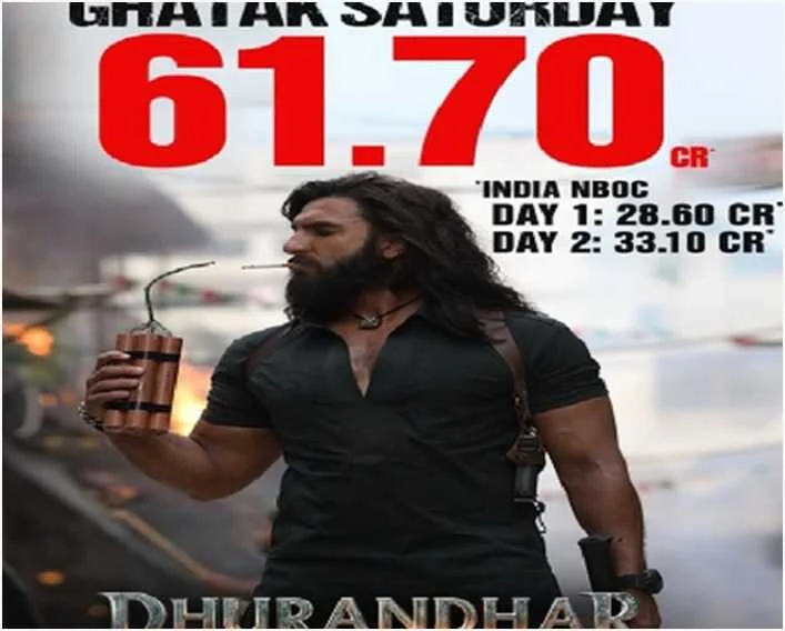 फिल्म के ताज़ा कलेक्शन आंकड़े बताते हैं कि पहले दिन ‘धुरंधर’ ने लगभग 28.60 करोड़ रुपये, जबकि दूसरे दिन 33.10 करोड़ रुपये की कमाई की। कुल मिलाकर फिल्म ने 61 करोड़ से अधिक का शानदार बिज़नेस कर लिया है।