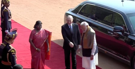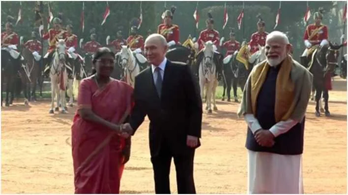 नई दिल्ली, 5 दिसंबर। रूस के राष्ट्रपति व्लादिमीर पुतिन भारत के दो दिवसीय दौरे पर हैं और उनके आगमन के दूसरे दिन की शुरुआत राष्ट्रपति भवन में औपचारिक स्वागत समारोह के साथ हुई। राष्ट्रपति पुतिन का स्वागत राष्ट्रपति द्रौपदी मुखर्जी और प्रधानमंत्री नरेंद्र मोदी ने किया।